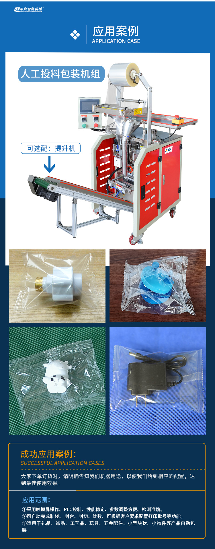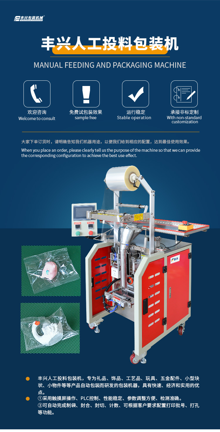 訂購(gòu)熱線(xiàn):0760-22122022豐興人工投料包裝機(jī),是專(zhuān)為禮品、飾品、工藝品、玩具、五金配件、小型塊狀、小物件等等產(chǎn)品自動(dòng)包裝而研發(fā)的包裝機(jī)器,具有快速、經(jīng)濟(jì)和實(shí)用的優(yōu)點(diǎn)。