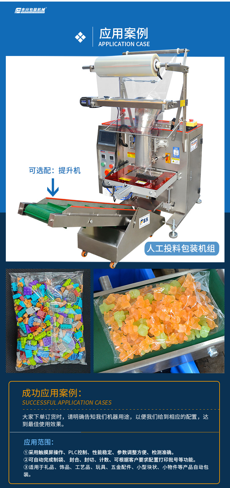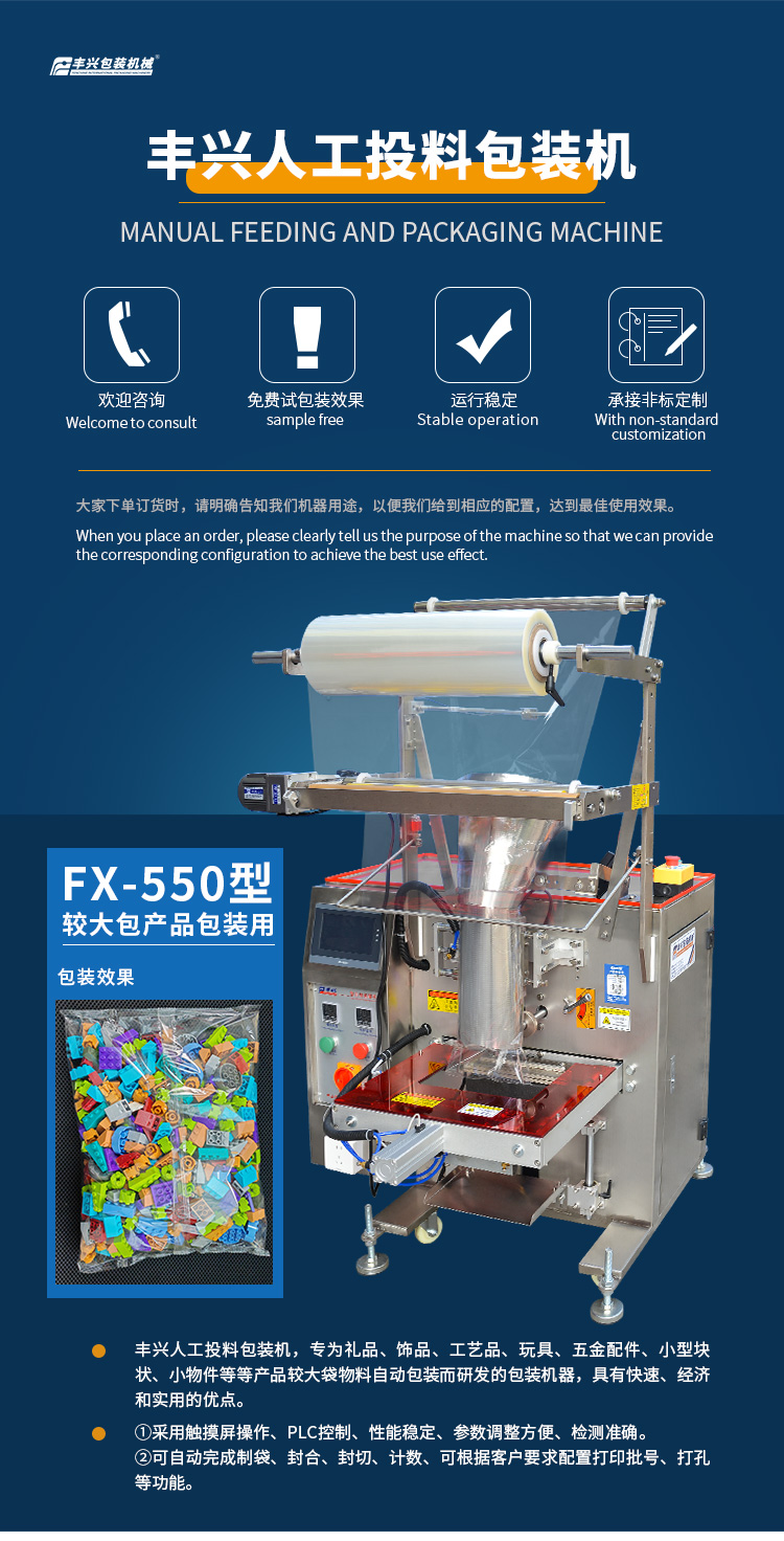 豐興人工投料包裝機,專為禮品、飾品、工藝品、玩具、五金配件、小型塊狀、小物件等等產(chǎn)品較大袋物料自動包裝而研發(fā)的包裝機器,具有快速、經(jīng)濟和實用的優(yōu)點。